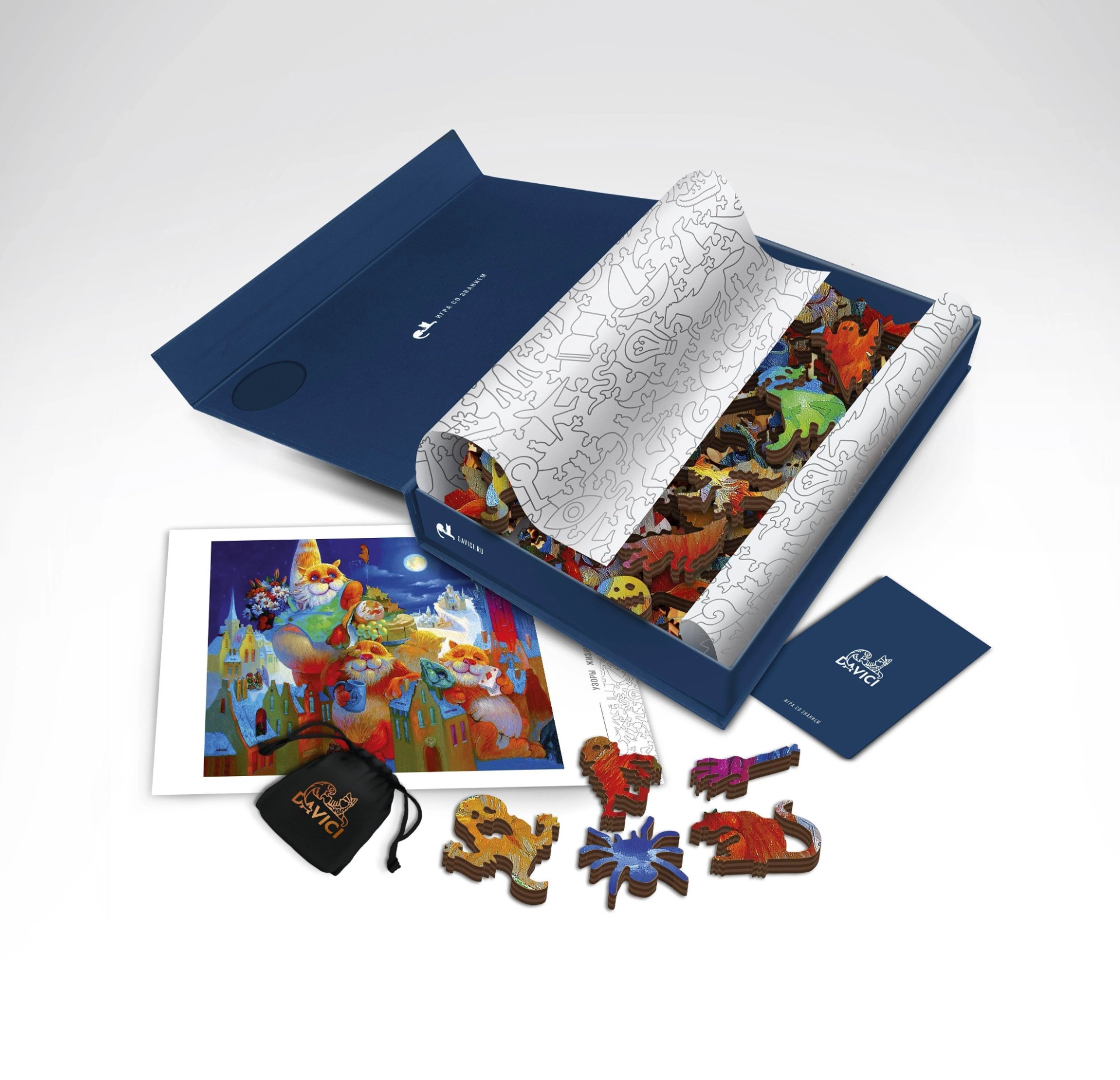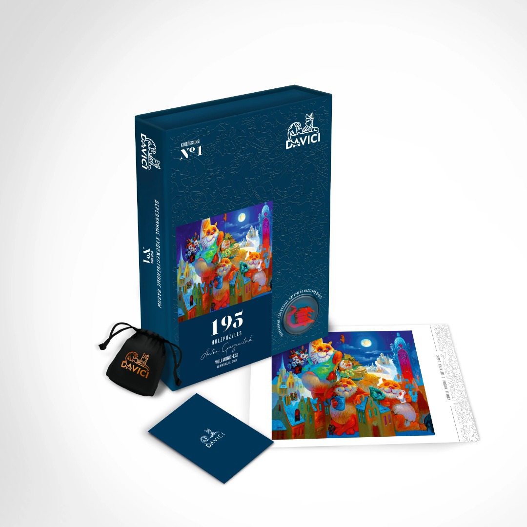 Davici is een zeer exclusief Amerikaans puzzelmerk met houten puzzelstukjes. In plaats van de gebruikelijke details hebben deze puzzelstukjes de figuren van vogels en dieren, draken en vreemde vissen, koningen en zwervers, sterren en planeten, huizen en steden. Honderden helden van sprookjes en surrealistische verhalen. Er wordt gebruik gemaakt van natuurlijk papier, berkenhout en een onschadelijkeniet-giftige lijm.