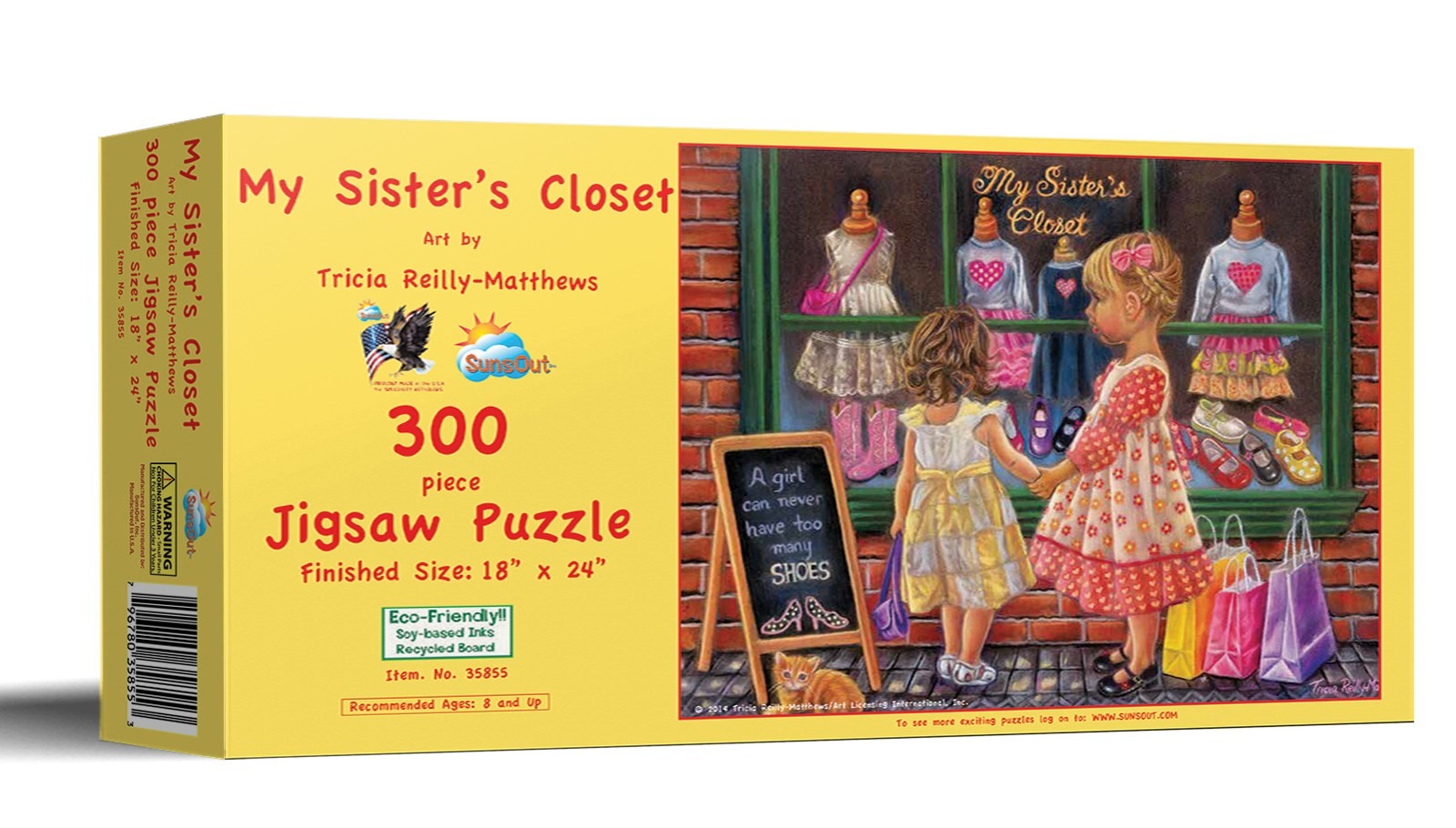 SunsOut is een Amerikaans merk van uitstekende kwaliteit. De puzzelstukjes hebben een goede dikte, zijn gevarieerd en hebben een perfecte pasvorm. Wordt in soort van rastervorm gelegd maar omdat er veel variatie in de puzzelstukjes zit, is het meteen duidelijk of ze passen of niet. De vormpuzzels hebben tevens puzzelstukjes met aparte vormen en worden derhalve dan ook niet in rastervorm gelegd. De puzzelstukjes zijn afgewerkt met een licht glanzend laagje. Deze puzzels worden milieu-vriendelijk geproduceerd van gerecycled karton.